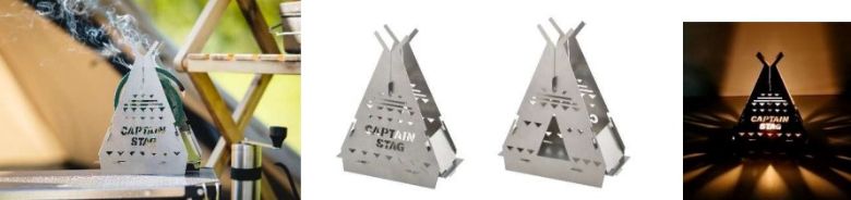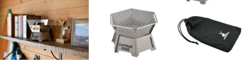 キャプテンスタッグを代表するヘキサ型焚火台のミニタイプ。クロス型の五徳を装備しているので、調理にも適している。パネル組み立て方式で、薄型収納バック付き。