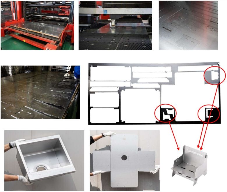 各外食チェーン店の要望に合わせて、OEM 小ロット生産を主とする同社は、高精度のレーザー切断機を持っている。コンピューターに図面データを入力することにより、厨房機器の材料を切断していく。その際に、一緒にキャプテンスタッグ用の部品を切断することで、効率よく端材を生かす方法に行きついた。