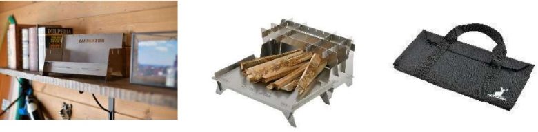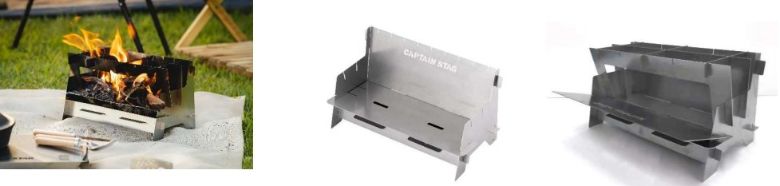 3 つの形状にトランスフォームする焚火台。パネル組み立て方式で、薄型収納バック付き。