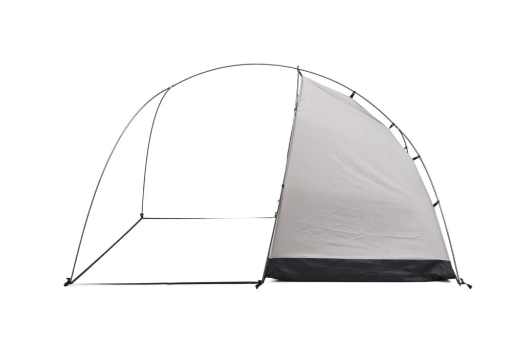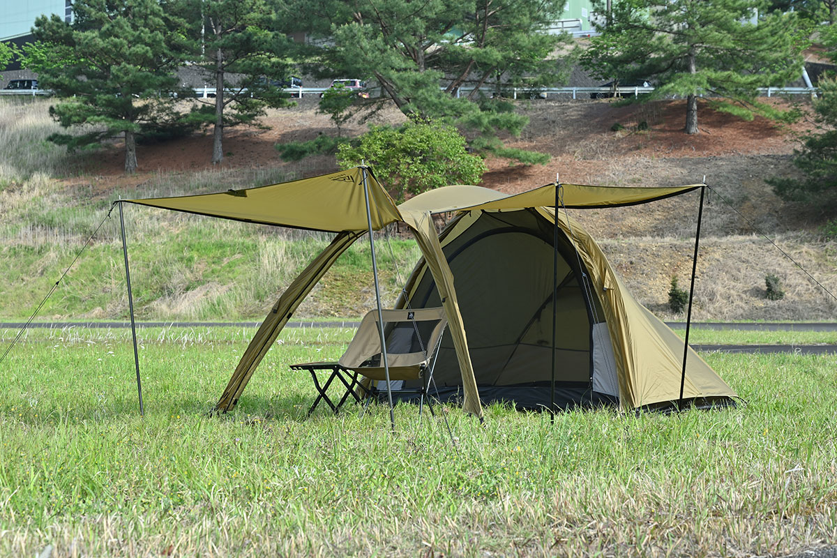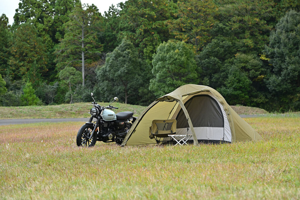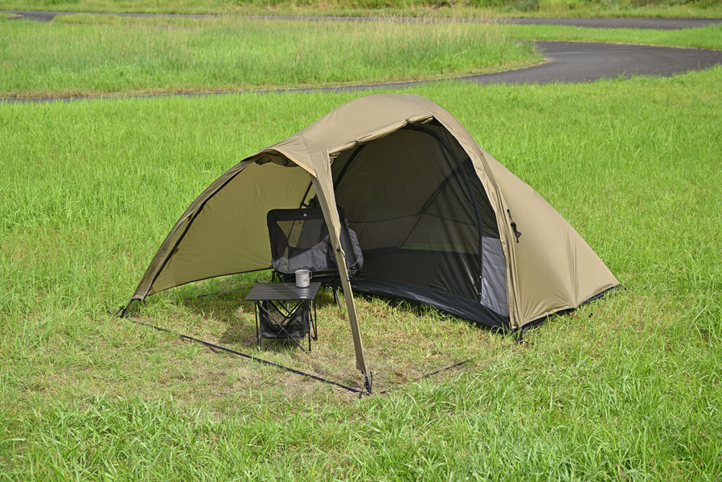 同製品は、広大な前室部はチェアに座ってくつろぐことができる十分なスペースを確保し、寝室部は1人用の就寝スペースと荷物を置いてもちょうどいい大きさが特徴のテントとなる。強度の高い20Dナイロンやアルミ合金等で軽量かつ頑丈なつくりとなっていてキャンプツーリングにも最適だ。