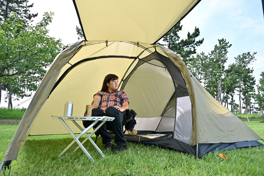 広大な前室部はチェアに座ってくつろぐことができる十分なスペースを確保、寝室部は1人用の就寝スペースと荷物を置いてちょうどいい大きさで窮屈感を全く感じません。