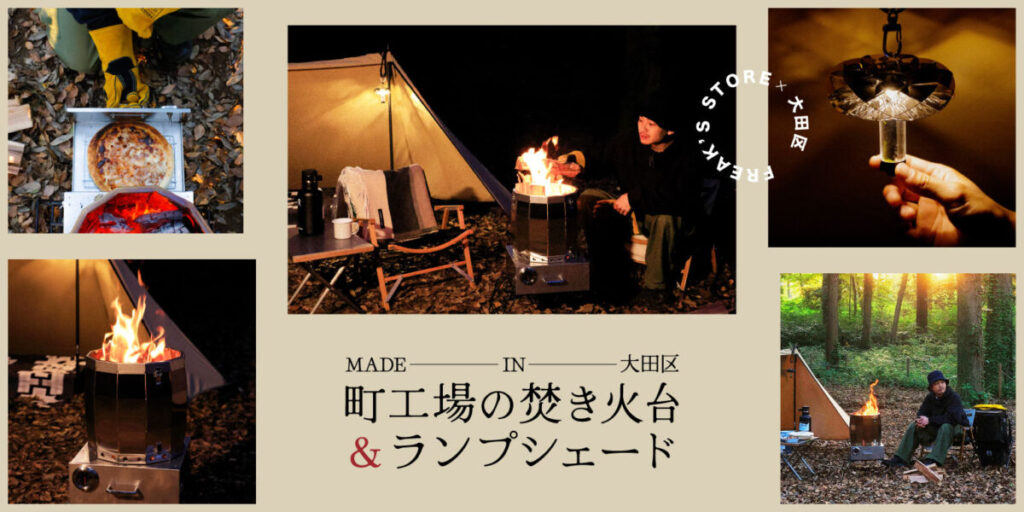 大田区町工場とFREAK’S STOREがタッグを組み、2型のアウトドアグッズが誕生!FREAK’S STOREが強みとするアウトドアをベースに、実績豊富な大田区を代表する大橋製作所の技術を生かし、両社のコラボレーションだからこそ生み出せる、こだわり満載のランプシェードと焚き火台が誕生し、2023年6月1日から受注販売を開始しました。