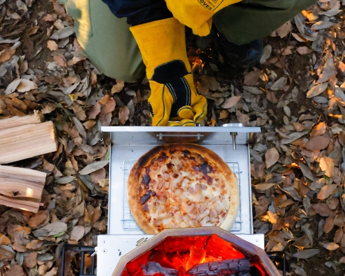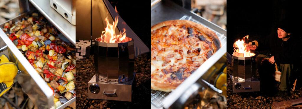 焚火台の部品がすべてオーブンに収納できるので持ち運びや保管がしやすく、また、素材をステンレスにすることで錆びづらく、手入れが簡単になるようにしています。 (※強風の際は風よけ等設置をお願いします。オーブン温度が上がりきらない場合があります。)
