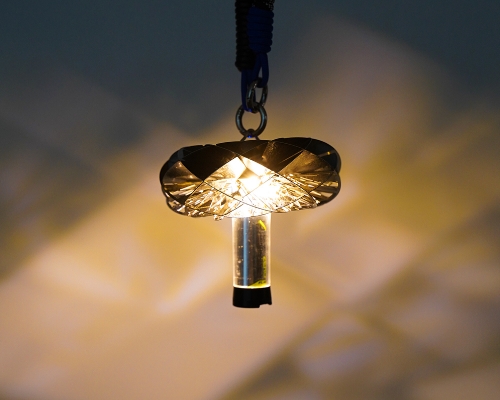 円の外側に回転軸を置き得られる回転体で「ドーナツ型」が特徴。ステンレス板を一枚ずつ組み合わせて立体にしているため、幾何学的なデザインの大小様々な穴から綺麗な光が抜ける設計になっています。