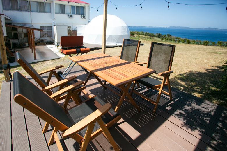 ドームすぐ横の広々としたウッドデッキテラスで海風を感じながらBBQ♪