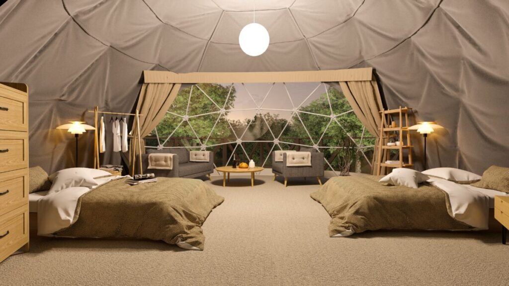 7棟あるドーム型テントは、広々としたデッキスペースを備えたプライベート空間が特徴です。冷暖房完備のドーム型テント内には、シングルベット2台とエキストラベットがあり、4名までゆったりと宿泊できます。お部屋は「スタンダードドーム」とプロジェクター付きの「シアタードーム」の2タイプを用意しています。