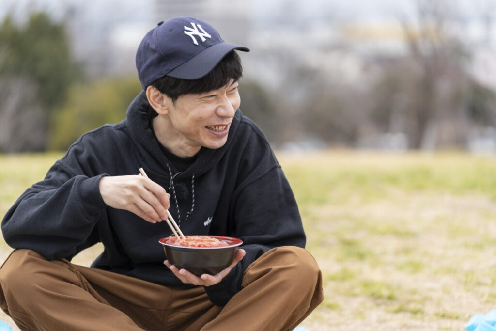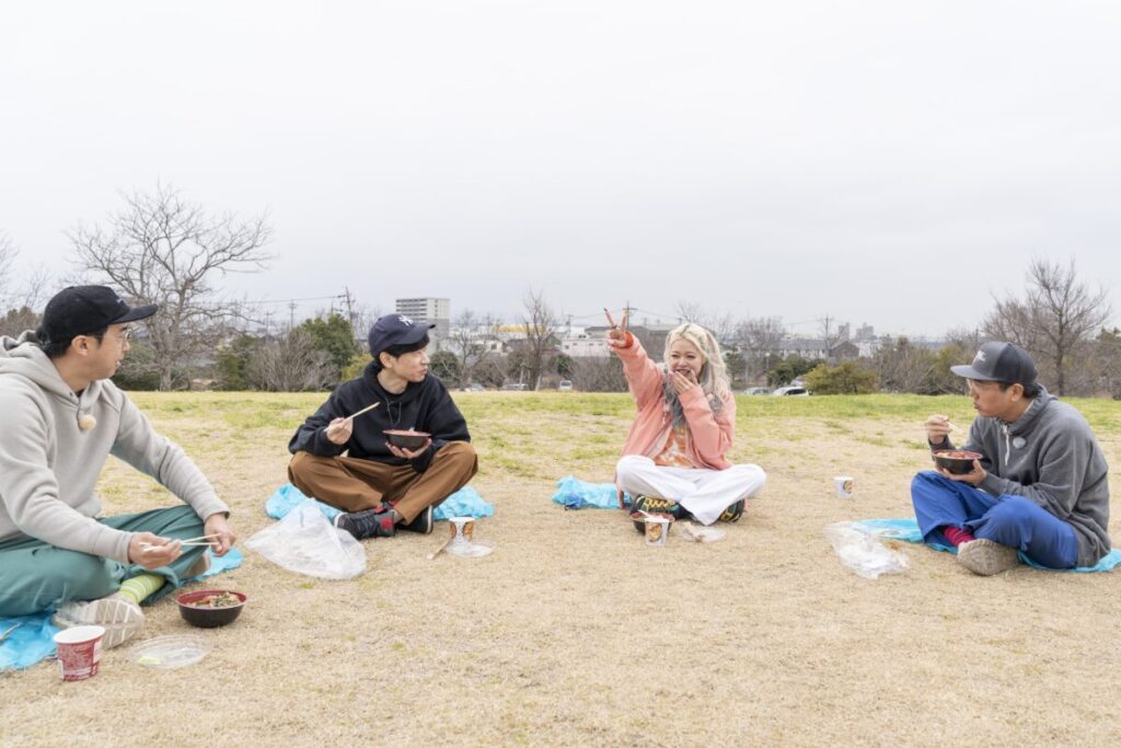 今回はキャンピングカーを活かしつつ、寄り道を楽しみながらキャンプ場を目指すプラン。まずは、国道沿いにあるドライバーや近隣住民に愛される地元の超人気グルメスポットへ。テイクアウトした海鮮丼と車内で作った味噌汁で、のどかに公園ランチを楽しんだ。