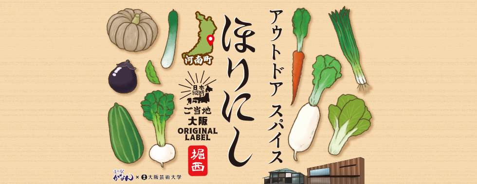 地元野菜と「道の駅かなん」をモチーフに、河南町の「大阪芸術大学」学生がデザイン制作を担当したラベル
