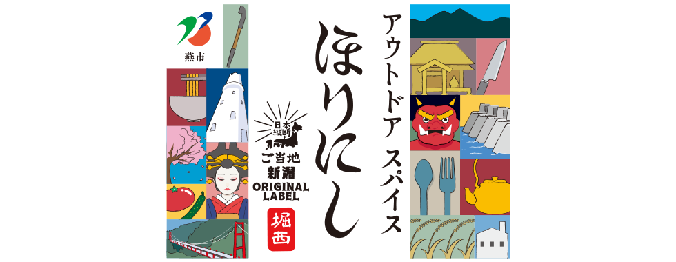 金属洋食器やおいらん道中、燕背脂ラーメンなど燕市の名物をちりばめたラベル