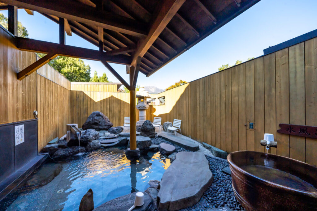 FOREST VILLA(フォレストヴィラ)のご宿泊者様はすぐ横にある露天風呂付の入浴施設の「美肌の湯」が半額で入浴可能。温泉成分を含んで軟水で仕上げられた「美肌の湯」は、しっとりとお肌が潤い、まるで「温泉に入ったような入浴」を楽しめます。