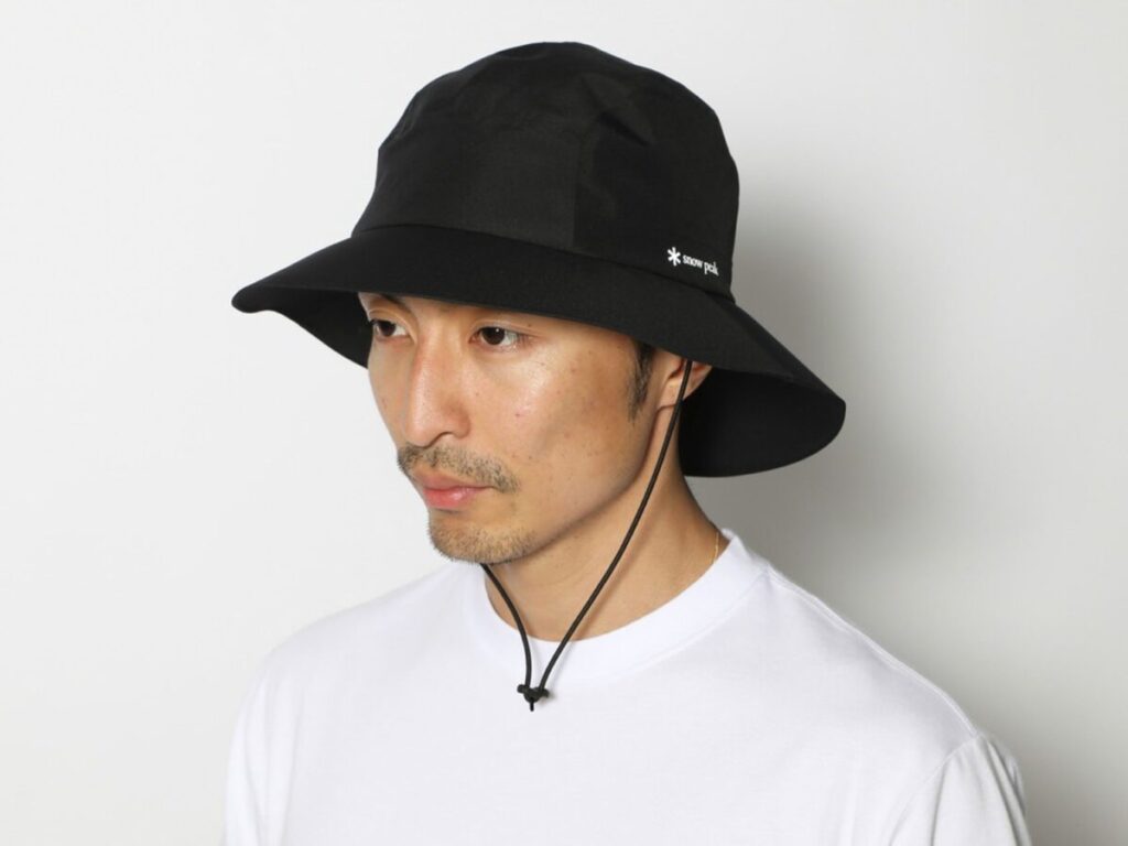フィット感の高いゴムスピンドルのアゴ紐が付いたレインハット。しっかりとしたツバが各方向からの雨粒を遮ってくれます。内側には吸水速乾性を備えたビンカワを使用。後部にサイズ調整のベルクロを内蔵し、風の強い日も飛ばされる心配がありません。合わせやすいシンプルな無地のデザインで、サイドに配したSnow Peakロゴがワンポイントです。