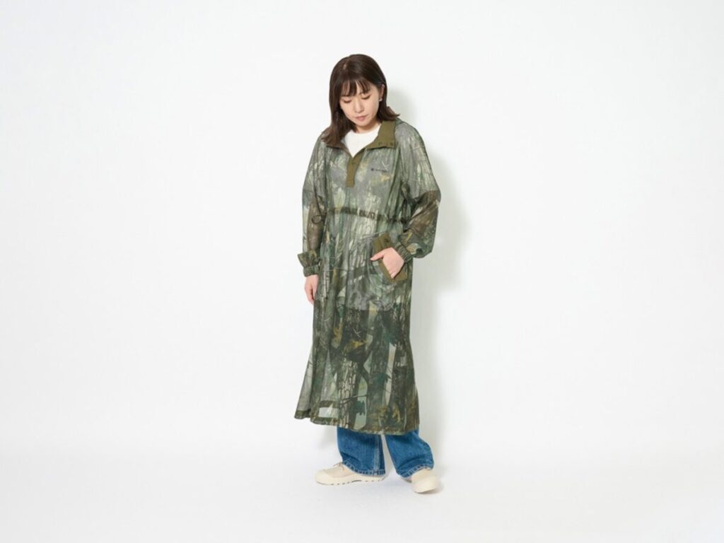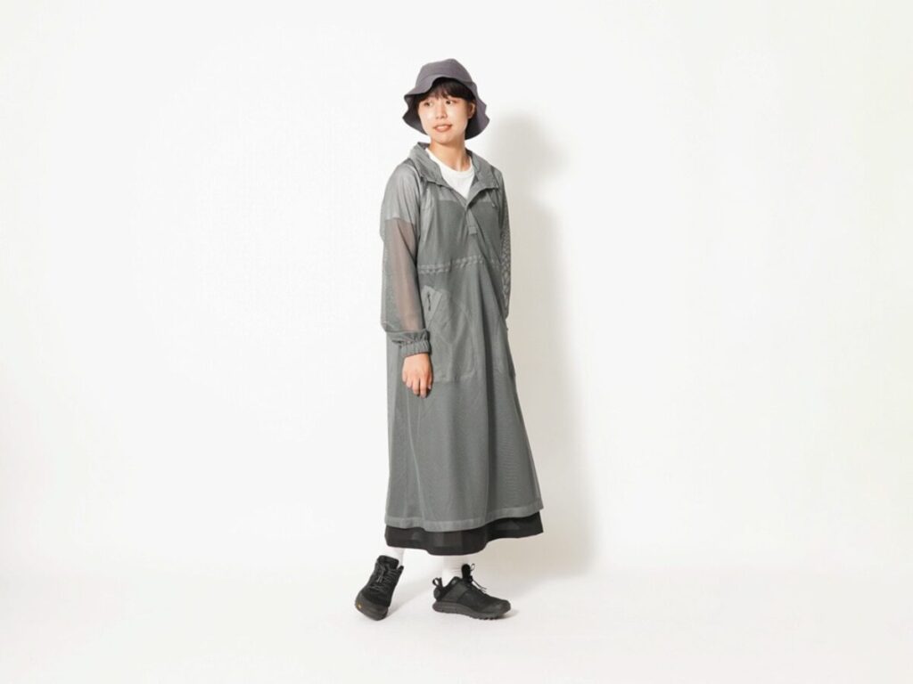 ウィメンズ用ロング丈プルオーバー。薄着の夏服の上からラフに重ねられるゆったりしたサイズで虫除けに加え、軽い日除けの二役をこなします。ウエストのドローコードでシルエット調整も可能。ワンピースのようなフェミニンな仕上がりになります。襟部分にはフードが収納され、顔まわりをガードしたいときに活躍。脇には袋ポケットに加え、内側の服へ繋げられるファスナー式スルーポケットも配置しました。
