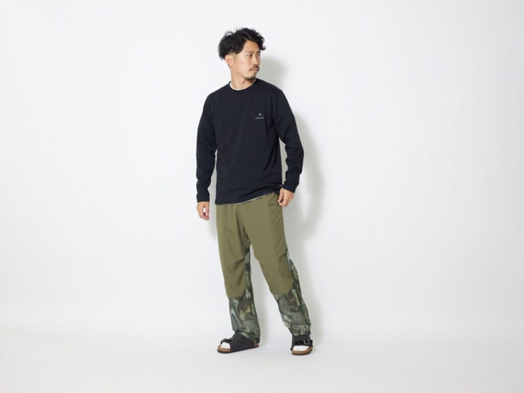 一枚着でも着用可能なオーバーパンツ。ウエストはオリジナルバックルを採用したベルト仕様で、コードを通した裾周り同様にアジャストが可能。可動域の広い膝周りまで布帛を使用して補強し、膝部分にはタックを入れて動きやすさも確保しました。脇には物落ち防止のドットボタン付きポケットに加え、オーバーパンツとして着用した際に内側の衣服にも繋がるようにファスナー式スルーポケットも配置。ウエスト左部分にはカラビナや鍵等を提げられるDカン付き。
