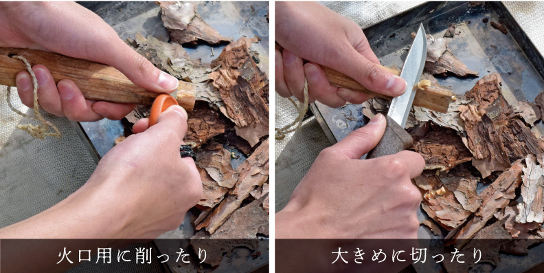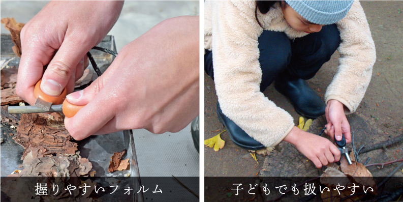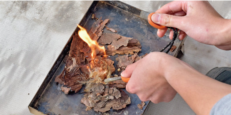 ファイヤースチールの根本から、ストライカーでしっかりと押し削り火花を散らす。 ポイントは、ストライカーで削る際の「力加減」と「速さ」。しっかりと力を込めて、 マッチを擦る時よりもややスローに押し削れば、初心者でも簡単に火花を飛ばせるはず。