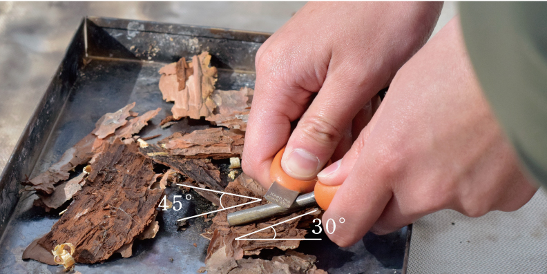 ファイヤースチールは地面に対して約30°、ストライカーはファイヤースチールに対して 約45°の角度で押し削ると、より効率的に着火することができる。 ファイヤースチールの先端に火花が飛ぶので、その先に火口がくるよう位置の調整を。