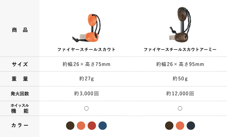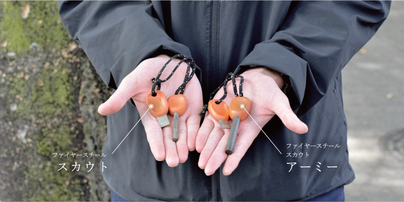 ファイヤースチールは燃料切れの心配がない上、湿気にも強く、コンパクトで持ち運びもしやすい。 普段はライターやマッチを使用している人でも、ファイヤースチールをザックに忍ばせておけば、 雨で濡れてしまったり、ガスバーナーにトラブルがあった場合でも焚き火を起こすことができ、 緊急時にはホイッスルとして使用することができる。 キャンプ用にはもちろん、日常生活においても不足の事態に備えて1つ持っておくと安心だ。