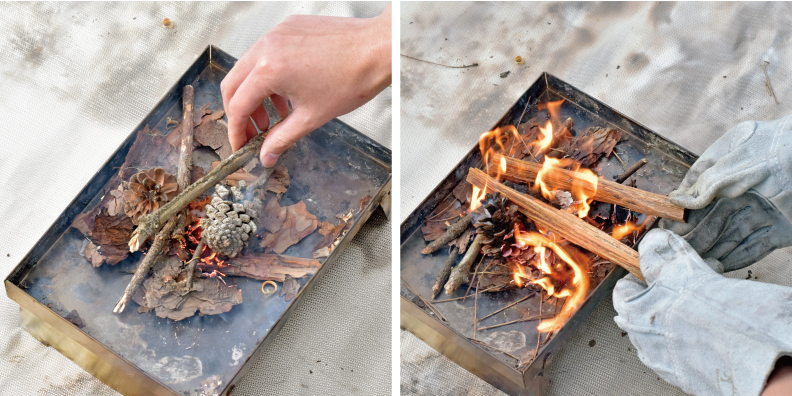 それでは早速火起こしの準備を。 まずは焚き火台を組み立てて、 ナイフで麻紐を10~20㎝ほどの長さに切り、手やナイフでほぐして火口を作る。 ナイフで麻紐をほぐす際は、あまり力を入れず軽く表面を擦るほうが毛羽立ちやすい。 火口ができたら、焚き火台の上に松ぼっくりや枯れ葉を敷き、その上に先ほど作った火口を置く。