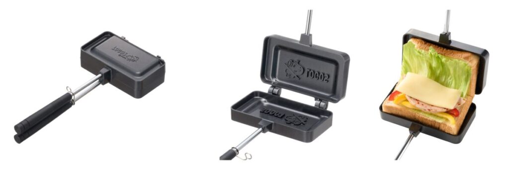 食パンをミミごと挟むことができるサイズで、好きな具材をはさんで焼くだけと簡単です。女性やお子様にもおすすめの食べきりやすいサイズのホットサンドを作ることができ、ガスコンロやたき火での調理に対応するので、ソロキャンプや一人暮らしの食卓で活躍します。焼いてから、包丁で切り分ける手間も省けるので、キャンプの朝の時短にもなります。