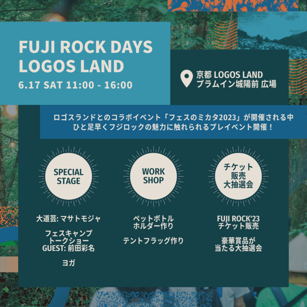 株式会社ロゴスコーポレーションは、同社が展開する総合アウトドアレジャー施設『京都ロゴスランド』にて、国内最大級の野外ロック・フェスティバル「FUJI ROCK FESTIVAL」とコラボレーションし、1日限りのスペシャルイベント「FUJI ROCK DAYS at LOGOS LAND」を、2023年6月17日(土)に開催する。