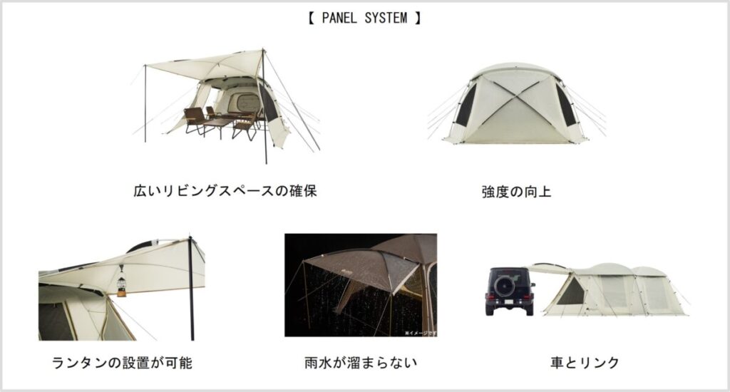 LOGOS独自のPANEL SYSTEMを搭載。テント前面部分にアーチ型のフレームを通すことでフルクローズ時の強度が向上したほか、2本のキャノピーポールで支えると自立するタープとなり、よりゆったりとしたリビングスペースを確保できる。車とのリンクやランタンの吊り下げも可能。また、オープン時に雨水が溜まる心配もない。