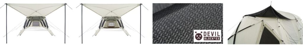 インナーテントは着脱可能。フライシート単独では大型のスクリーンタープとして使用できる。メッシュ窓には、LOGOSが独自に開発した高機能メッシュ「デビルブロックEX」を採用しており、風を通しながら紫外線や虫の侵入を防止。トップシートにはUV-CUT率99.9%以上、遮光率100%(※1)のソーラーブロック加工を施し、日向と日陰で-15℃の温度差(※2)を実現。
