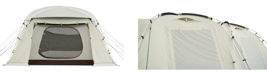 換気性に優れたベンチレーションをフライシートに上部に搭載。また、インナーテントのドアは270度開閉のC型ドアなので、上下別々で巻き上げれば大型ベンチレーションとして活躍。空気が循環して結露を防ぎ、快適な空間を実現。