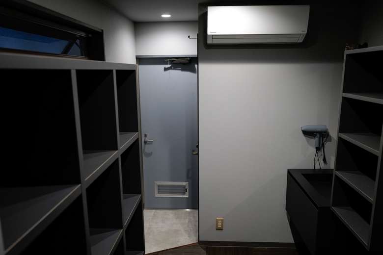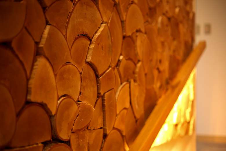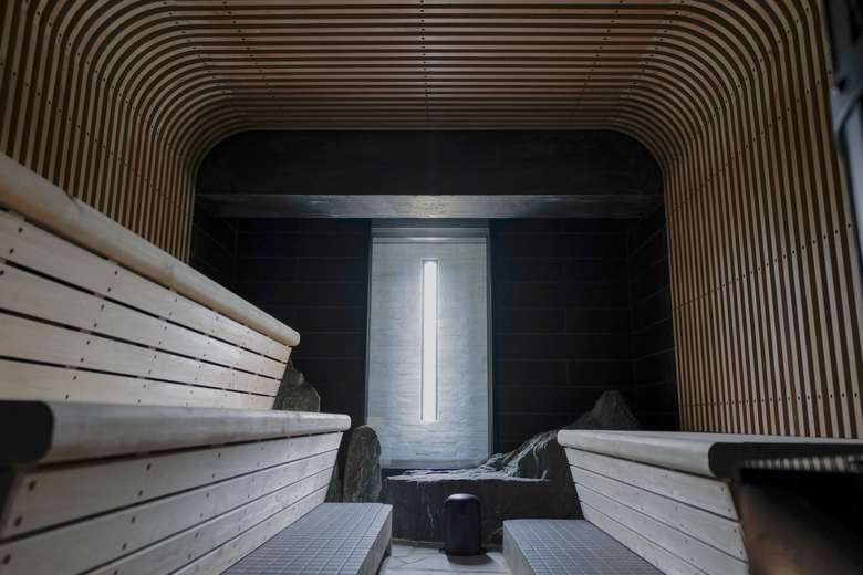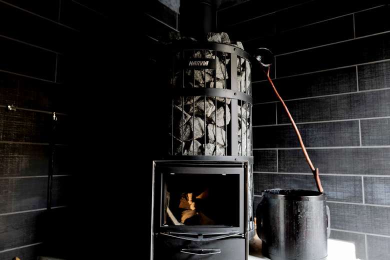 HARVIA社製のサウナストーブLEGEND300を設置し、天井は蒸気がまわりこみやすいアール設計。蒸気の対流をダイレクトに感じる天井高1.1mの座面に腰を掛け、壁からの輻射熱と薪き火のやわらかい熱があなたを包み込む。