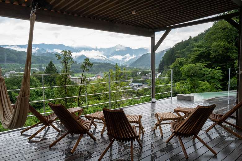 カラ松の大きなテーブルを囲んで話せるリビングスペースや男女別の寝室、谷川岳を一望できる屋根付きウッドデッキ、焚き火を囲めるファイヤーピット付きの貸切りコテージに宿泊できる。