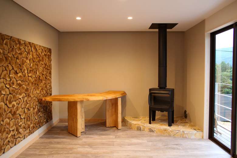 地元広葉樹の壁と薪ストーブがあるリビングで、サウナ後の休憩やミーティング・デスクワークなどのちょっとした仕事もできる。