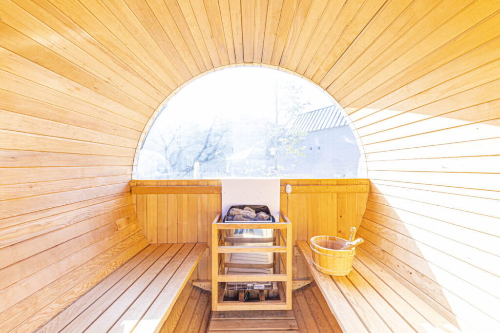 樽型で人気のバレルサウナを全棟にご用意しております。湿度が高く温度がやや低いフィンランド式サウナストーブを導入。熱したサウナストーンに水をかけるロウリュもお楽しみいただける他、リラックス効果のあるアロマオイルもご利用いただけます。