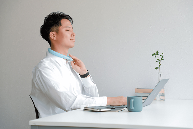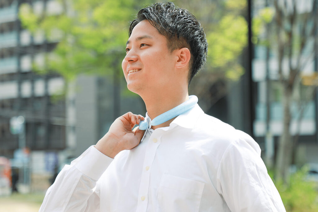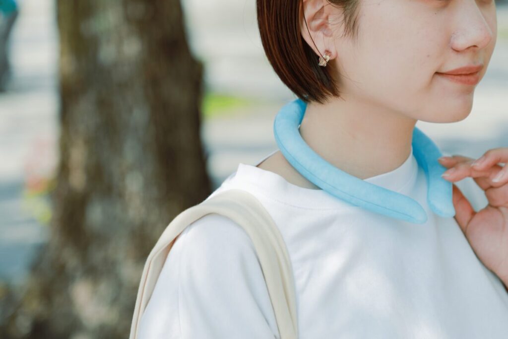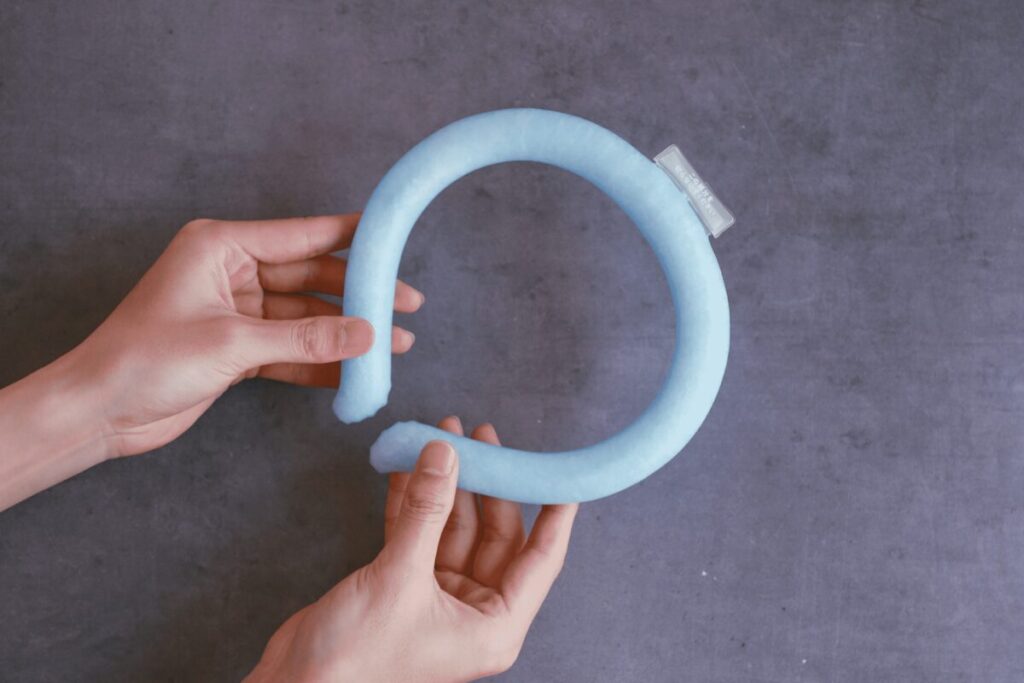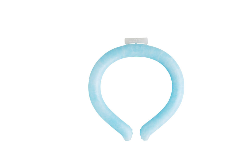 28℃未満で自然凍結するPCM素材を使用しており、改良を重ねたWリング構造により課題だった保冷持続時間を約1.8倍の3時間に延ばすことができました。電源がいらず、首に装着するだけでクールダウンできるので、熱中症対策として重宝するアイテムです。