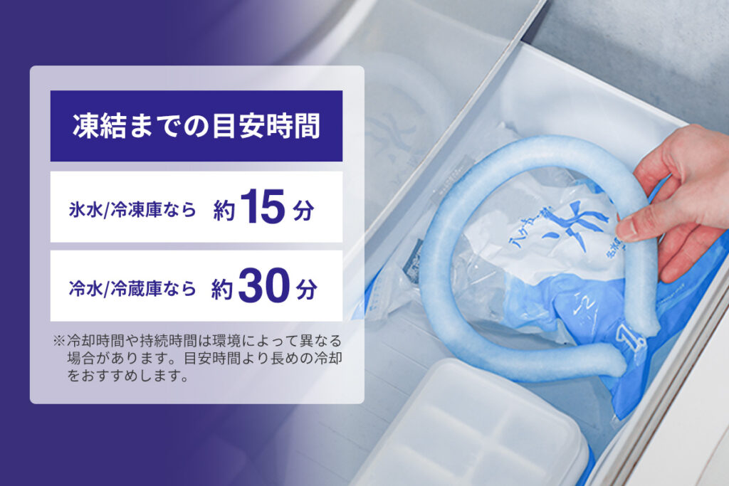たった15分、冷凍庫で冷やすだけで約3時間使用できます。忙しい朝や急な外出でも、身支度の時間で凍結できます。