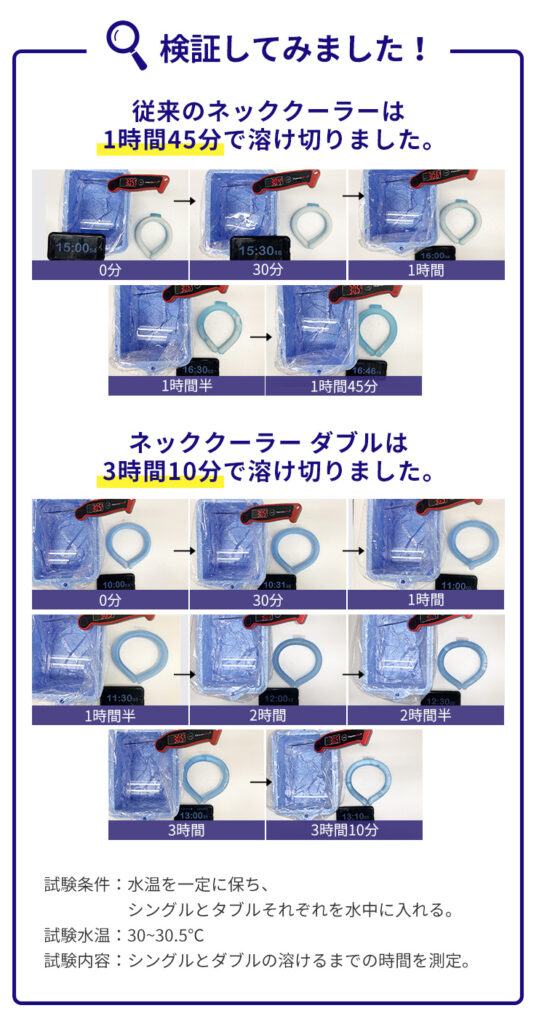 従来製品の保冷持続時間は1時間45分でしたが、2層構造の「ネッククーラー ダブル」は約1.8倍の3時間10分となりました。「家から職場までもたない」「買い物から帰る頃にはぬるくなっている」という従来製品の悩みを解決し、ひんやりとした心地よさが長続きします。