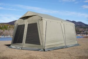 フレームは頑丈なスチール製のつや消しブラック、生地は防水加工を施したポリエステルオックスフォード二重生地、ワイルドシングスのブランドカラーであるバーンオリーブは自然と調和します。