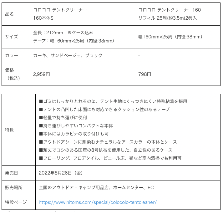 株式会社ニトムズ(本社:東京都品川区、代表取締役:中村 晃章)は、キャンパーのための粘着クリーナー『コロコロ テントクリーナー』を2022年8月26日(金)に発売します。