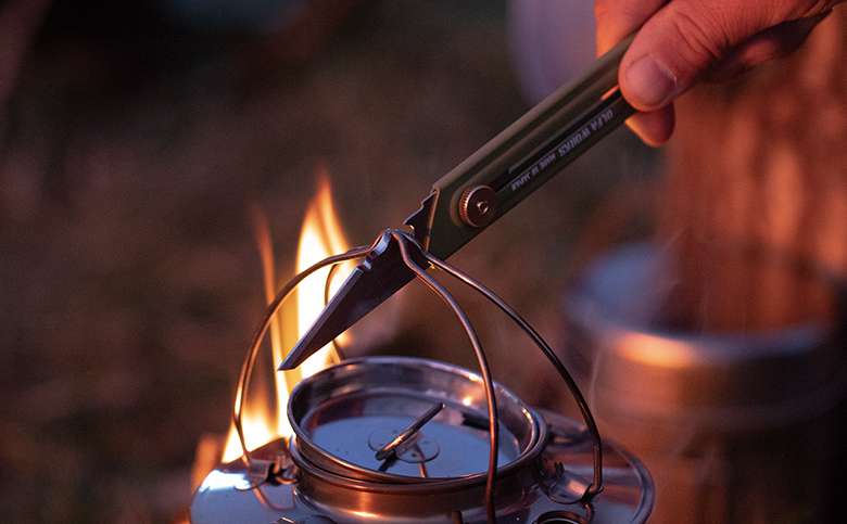 刃収納時は全長 121.5mm とコンパクトなので、ポケットやクッカーなどの中に入れて持ち運ぶことができる。