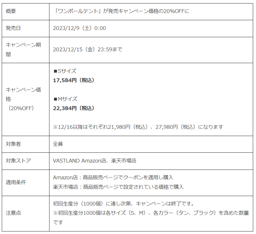 VASTLAND株式会社(本社:兵庫県姫路市/代表:田中悠貴)が運営するキャンプギアブランド「VASTLAND(ヴァストランド)」は、かんたんに設営できて、リビングスペースを兼ね備えた「ワンポールテント」を2023/12/9(土)にAmazon店&楽天市場店で先行発売することを決定しました。また発売を記念して、Amazon店&楽天市場店限定で20%OFFの価格で購入できる「発売キャンペーン」を【初回生産分1000個限定】で開催します。