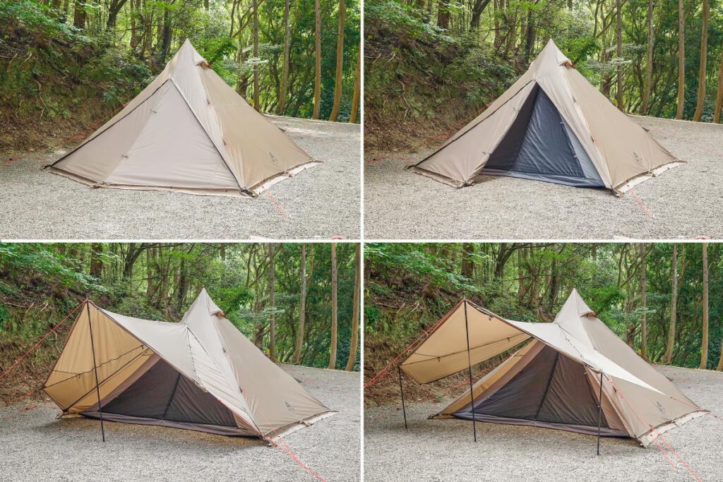 インナーテントを外してシェルターテントとしても使用可能、前後ダブルドア仕様のため、開放的な空間をつくることも可能です。