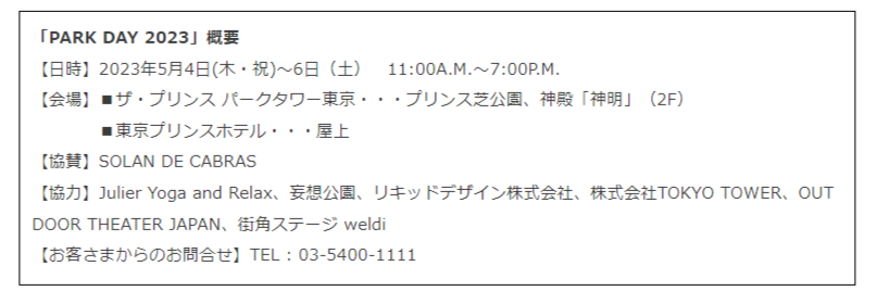ザ・プリンス パークタワー東京(所在地:東京都港区芝公園4-8-1 総支配人:神田泰寿)と東京プリンスホテル(所在地:東京都港区芝公園3-3-1 総支配人:石川学)は、ホテル敷地内のプリンス芝公園をメイン会場としたピクニックイベント「PARK DAY 2023」を、2023年5月4日(木・祝)から6日(土)までの3日間開催いたします。