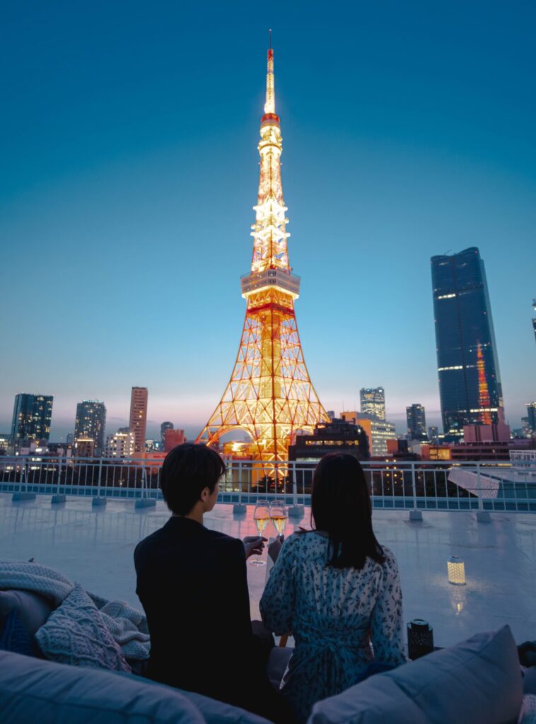 手の届きそうなほど近くの迫力ある東京タワーを目の前に、普段は入ることのできない屋上で夜ピクニック。ピクニックバスケットのアペタイザーを片手にアウトドアシアターをお楽しみいただきながら、特別なひとときを。