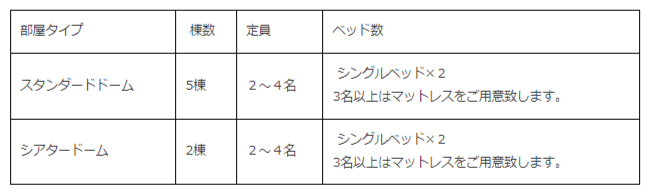 冷暖房完備のドーム型テント内には、シングルベッドを2台とエキストラを備え、4名までゆったりとお泊まりいただけます。お部屋は「スタンダードドーム」とプロジェクター付きの「シアタードーム」の2タイプよりお選びいただけます。
