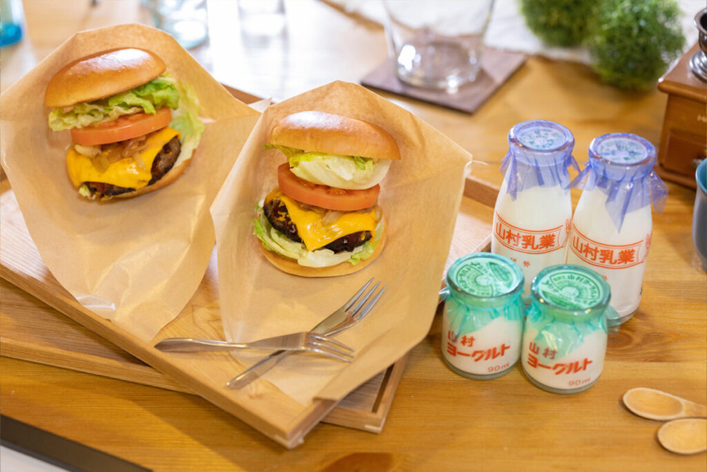 松阪牛バーガー、ヨーグルト、季節のフルーツ、牛乳、コーヒー