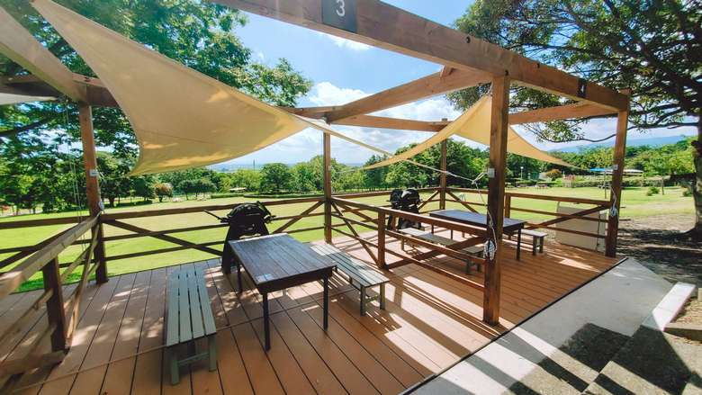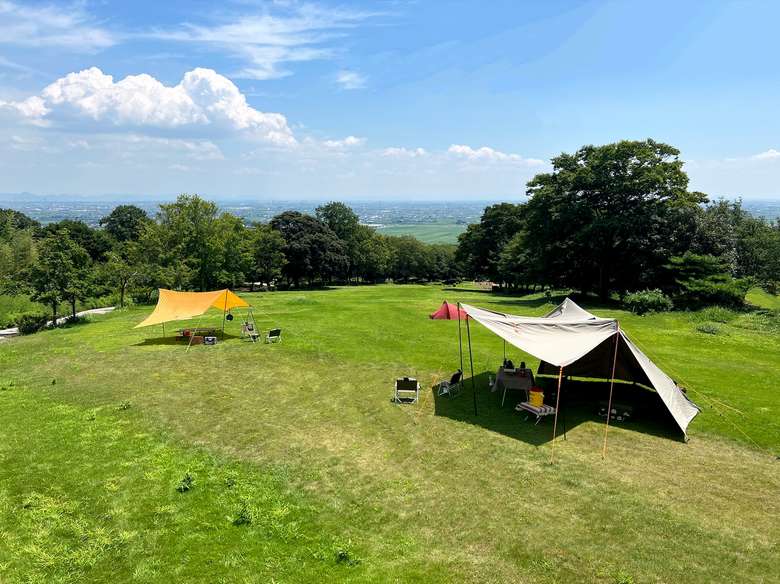 - 元ゴルフ場の芝生や丘陵地の地形を活かした広々としたキャンプサイト