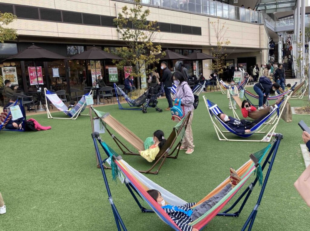 最大70台ものカラフルなハンモックが、南町田グランベリーパークのさまざまな場所に並びます。緑に囲まれた開放的な環境で、気軽にハンモック体験ができ、ショッピングの合間に休憩したい方やちょっとしたアウトドア気分を味わいたい方、本を片手に寝ころびながら読書を楽しみたい方など、心地よい揺れを感じながら思い思いにリラックスした時間をお過ごしいただけます。※会場の関係上、ハンモックの台数が少ない日程もございます。