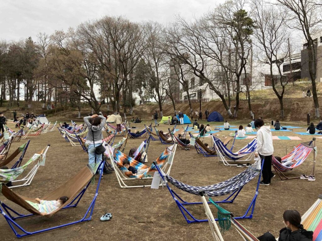 ① 最大70台!広い空の下で寝転んで心地よい揺れを体感できる「ハンモック体験」