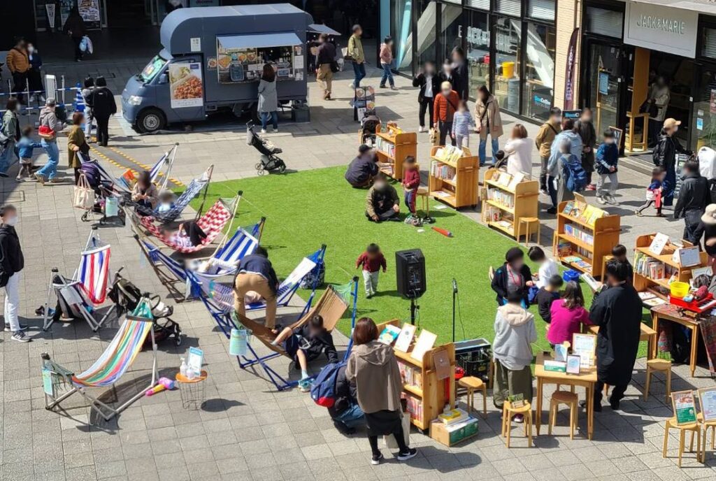 ② 約1,000冊の本や絵本に囲まれ、屋外で本を楽しむ「青空まちライブラリー」