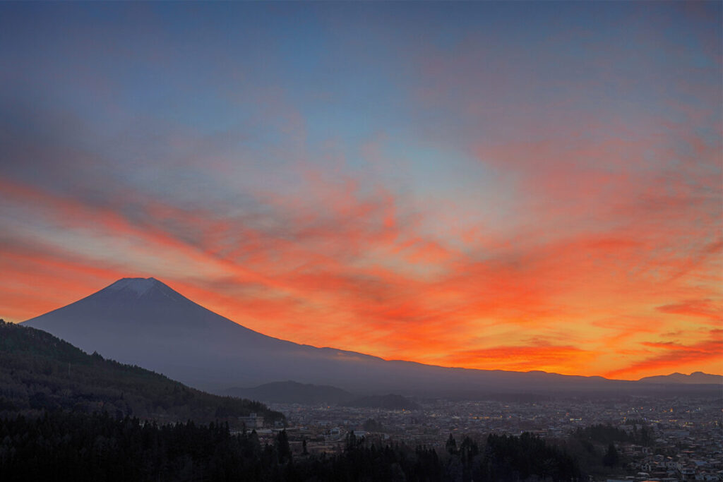 富士山のすそ野に沈む夕日の情景。日没後は満天の星空と市街地の明かりが美しい夜景も楽しめます。