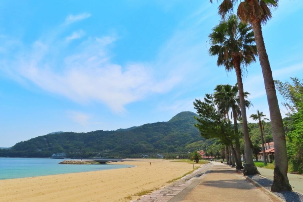 周防大島はヤシの並木や広大なビーチで有名な”映えスポット”です。