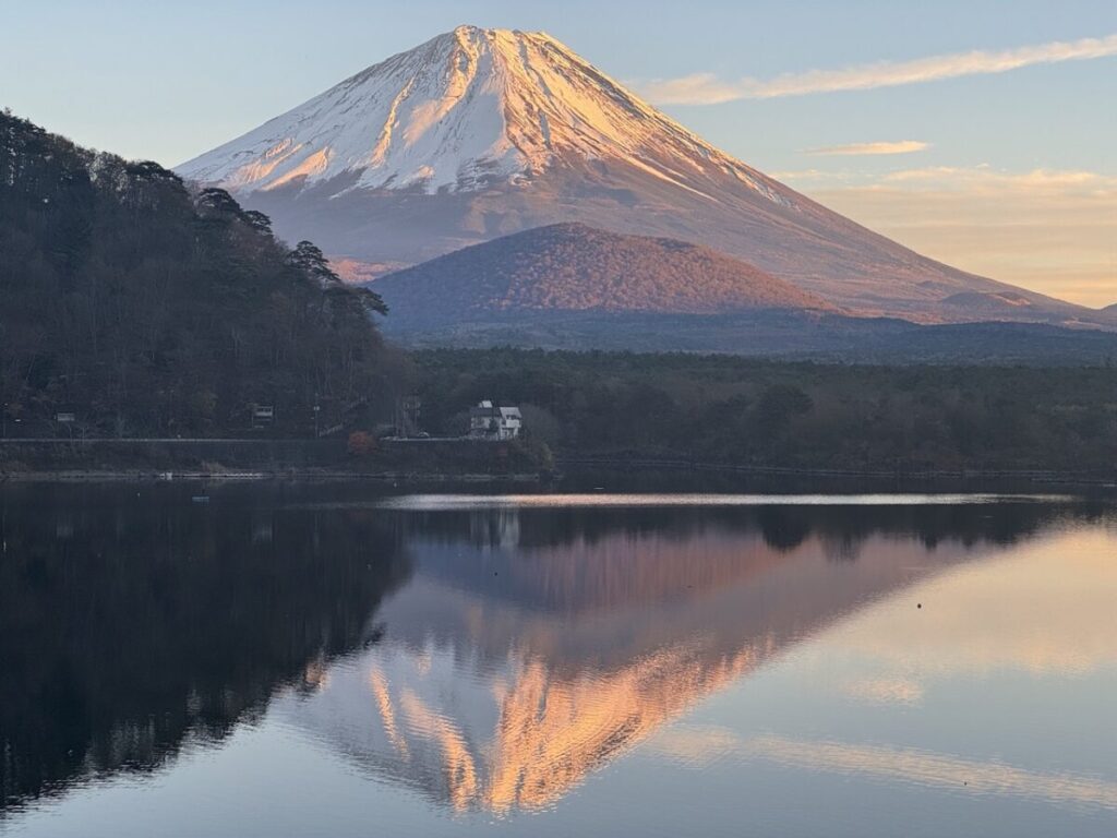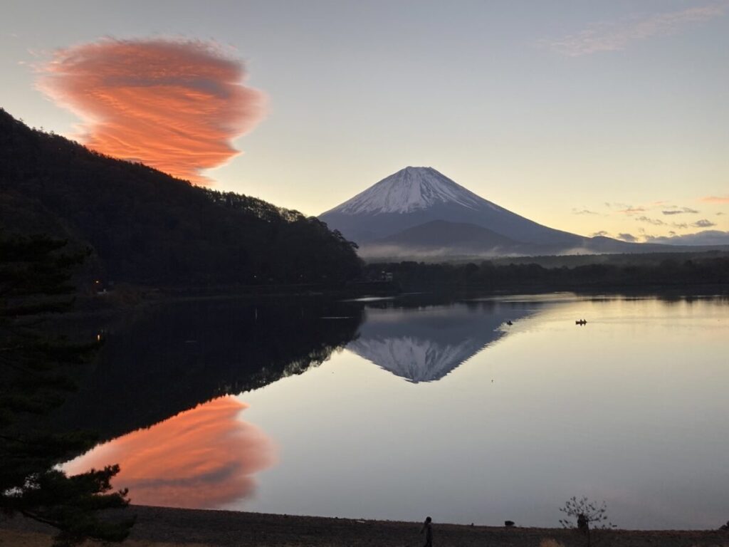 天気が良く風が穏やかな日には、湖面に映る「逆さ富士」をお楽しみいただけます。冬の時期には特に美しく輝き、朝と夕方の時間帯にはその綺麗な光景が一際際立ちます。