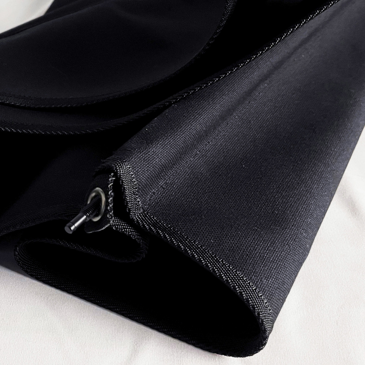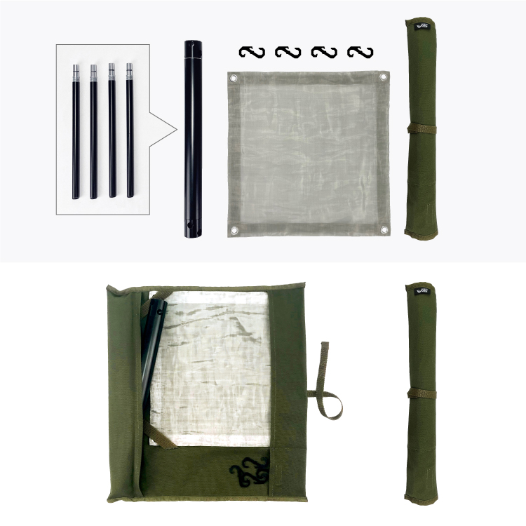 国内で丁寧に縫製された8号帆布の幕と、染色されたアルミシャフトによる真っ黒な焚火陣幕。